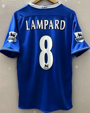 La maglia del Chelsea con il numero 8 di FRANK LAMPARD rappresenta al meglio la forza dei blues nella stagione 2003-04. Arricchita dalle patch della Premier League su entrambe le maniche, evidenzia la personalizzazione del fenomenale centrocampista inglese ad elevarne ulteriormente il prestigio