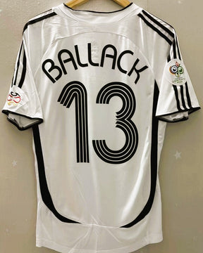 Una delle più belle maglie mai realizzate, quella della Germania stagione 2006-07 con il numero 13 di MICHAEL BALLACK. Un candido bianco interrotto da inserti gialli rossi e neri a richiamare la bandiera tedesca, la patch di Germany 2006 a evocare i mondiali e il talento del fenomenale centrocampista a elevare ulteriormente la qualità di questo autentico capolavoro