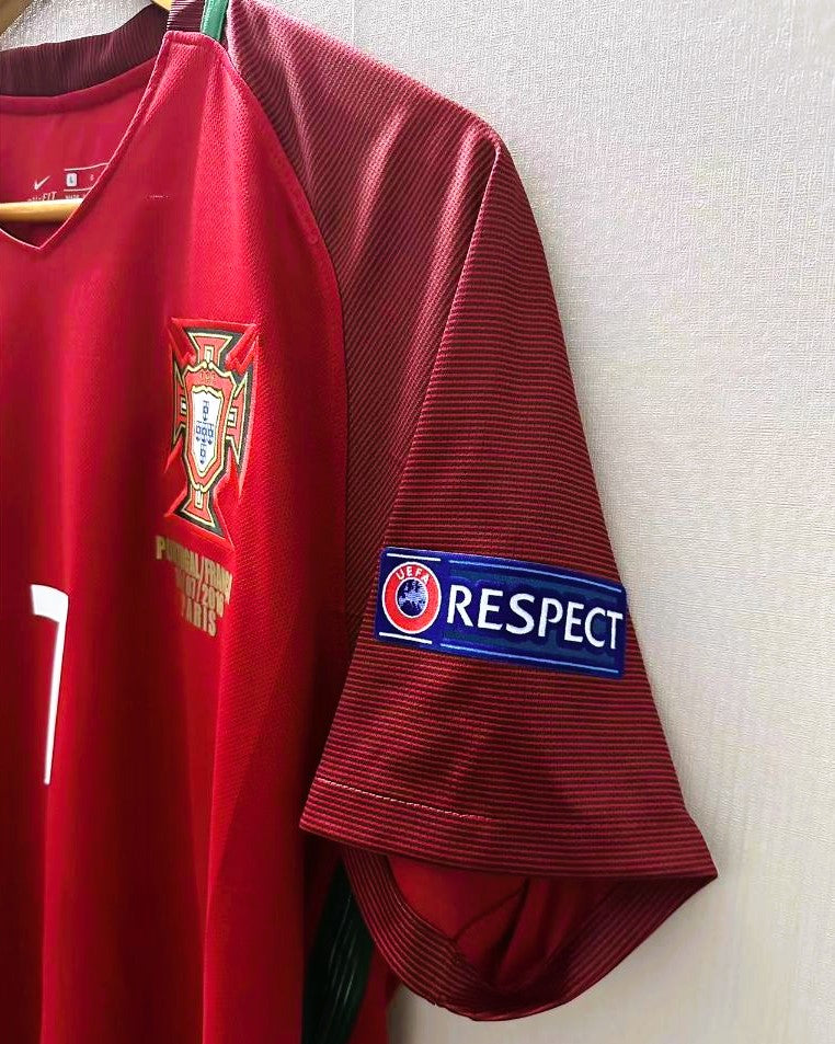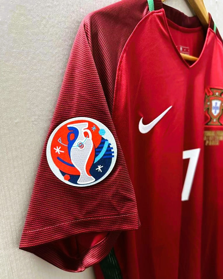 Rivivi la storia e la gloria del Portogallo con la maglia 2016-2017 indossata con il numero 7 da CRISTIANO RONALDO. Questo autentico capolavoro celebra il trionfo portoghese, con le patch di Euro 2016 e la scritta sul petto, a rappresentare il punto più alto della storia della nazionale lusitana Campione d'Europa trascinata dal proprio fenomenale leader e capitano
